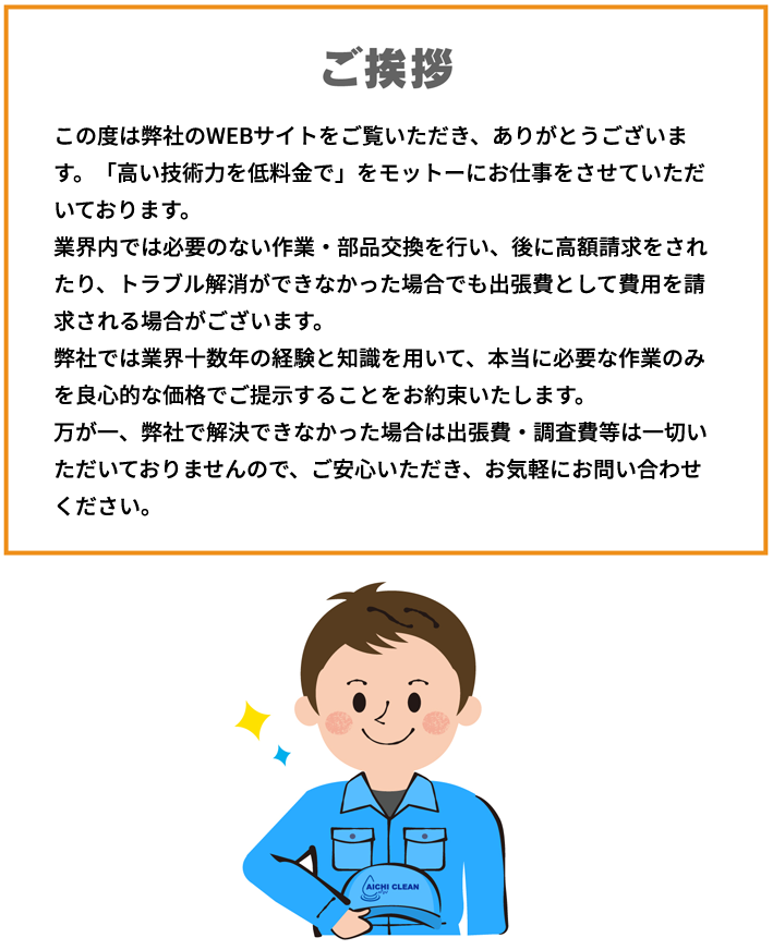 業界経験が長く、確かな技術力で数々のトラブルを解決。アイチクリーンにお任せください。
