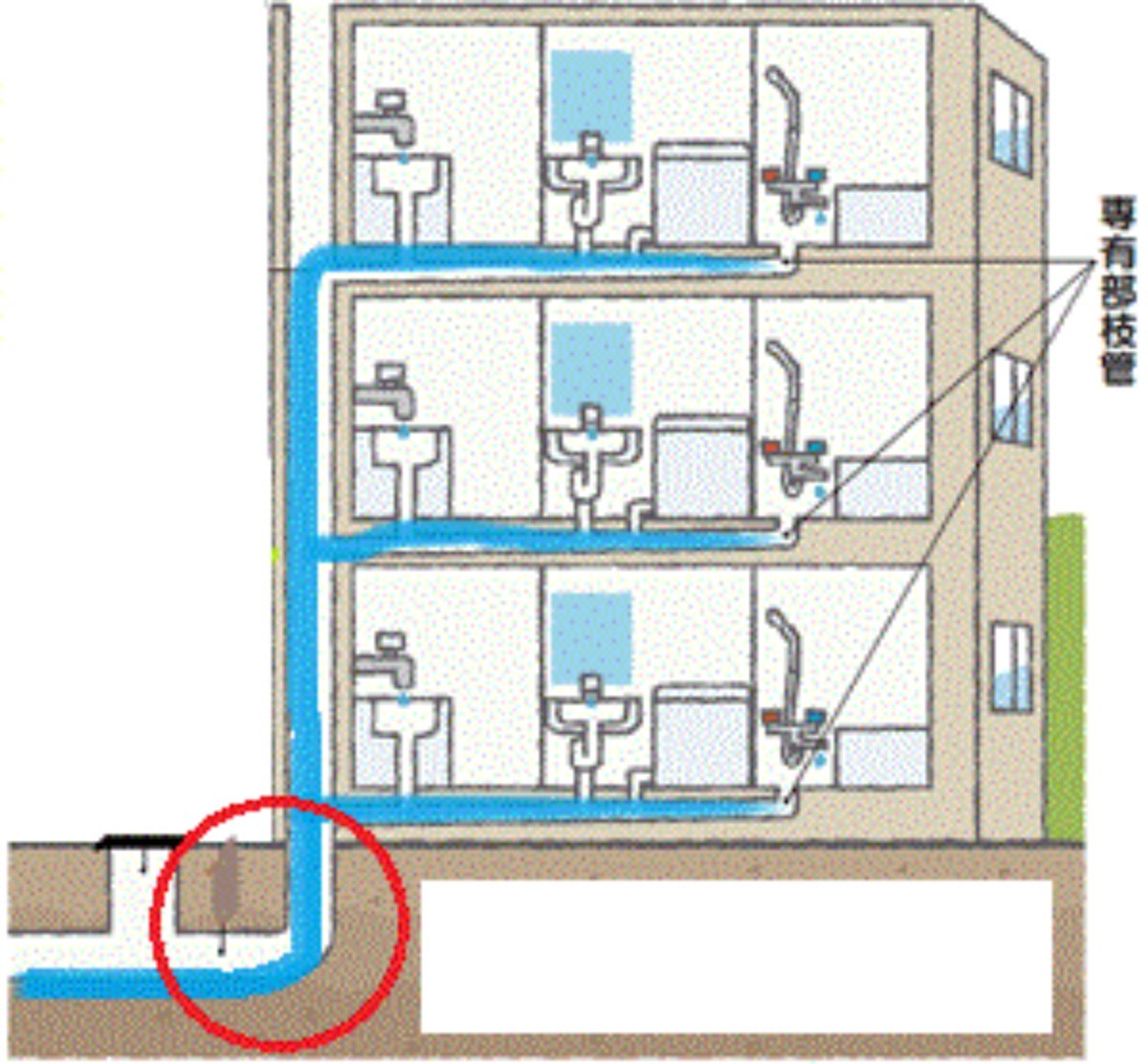 集合住宅の排水管は1部屋で使用の水が集まりそれを建物全体の縦引き管へ流れていきます。